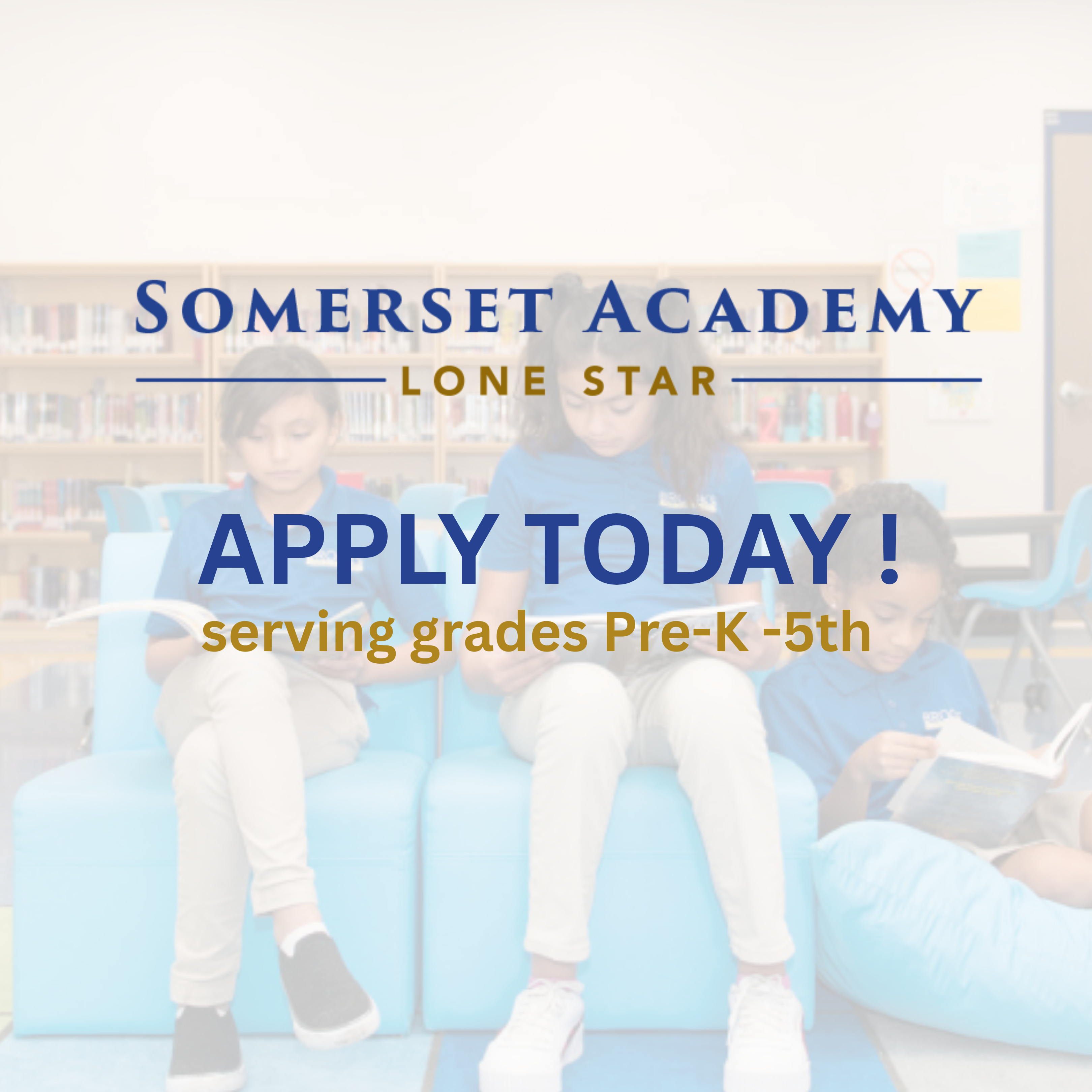 Somerset Academy Lone Star is still enrolling for all grade levels for the 2025-2026 School Year. For more info, call (210) 998-4452. Or email Chantel Kling at chantel.kling@somersetacademytx.org for more information. 2026-2027 Applications will become available on October 1st, 2025.